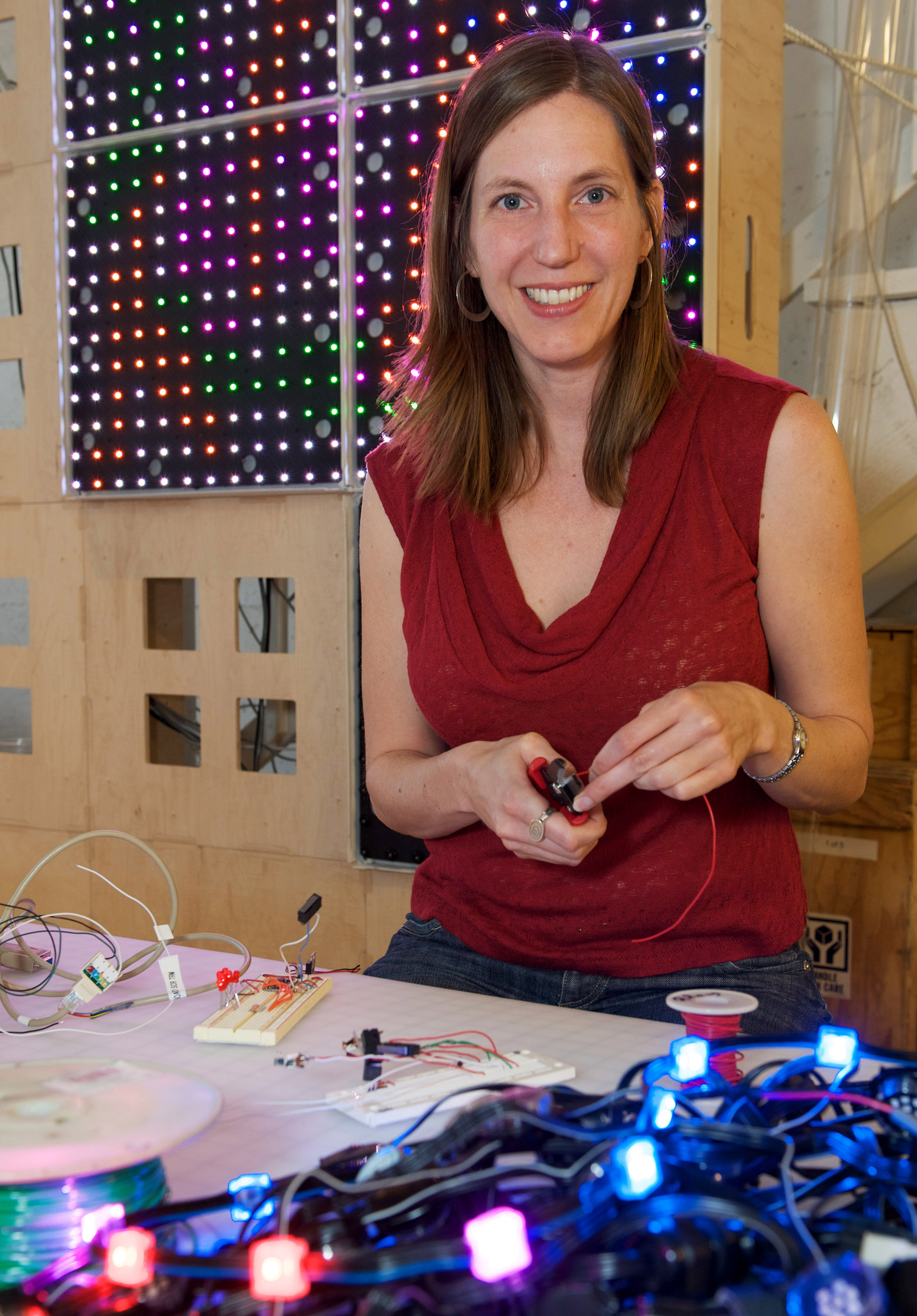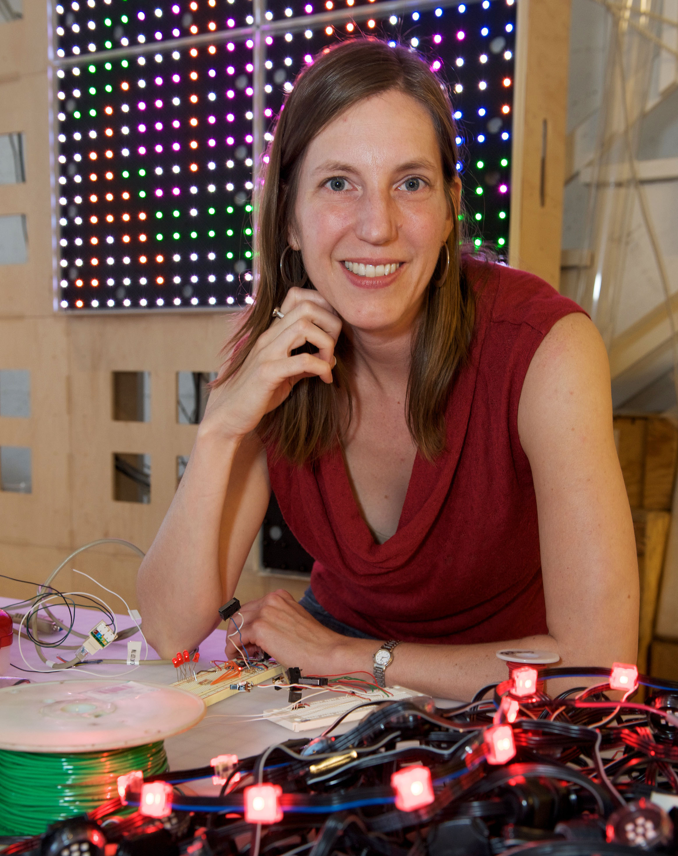 Camille Utterback is an artist who uses digital technologies to create visually arresting works that redefine how viewers experience and interact with art. Drawing upon traditional media such as painting, photography, and sculpture, she writes computer code that seamlessly blends the interactive elements of each piece with her aesthetic vision. In her 1999 video installation Text Rain, made with Romy Achituv, the interface of video camera and tracking software allows a viewer’s entire body to engage with text. As viewers stand in front of the projection, their shadows interrupt the falling streams of seemingly random words; the words eventually come to rest on the outline of the viewers’ bodies to reveal lines of a poem. With this distinctive and absorbing work, Utterback combines interactivity with a visual and literary experience that captivates people of all ages, including children. While her early work focused on text and movement, in recent years painterly imagery has had a profound influence on a number of her projects. In the External Measures series (2001-2008), she turned the digital medium into abstract pictorial compositions of infinite variety. These dynamic installations react to people’s motions and involve the viewer in the act of creating monumental paintings and drawings. Utterback’s Abundance (2007), a temporary outdoor video projected onto San Jose’s Richard Meier-designed City Hall dome, transformed an impersonal public space and modern edifice into a vibrant, colorful environment responsive to human presence and movement. With each subsequent project, Utterback is creating works that encourage audiences to take part in new and exciting artistic collaborations and enriching the experience of living in a technological age.
