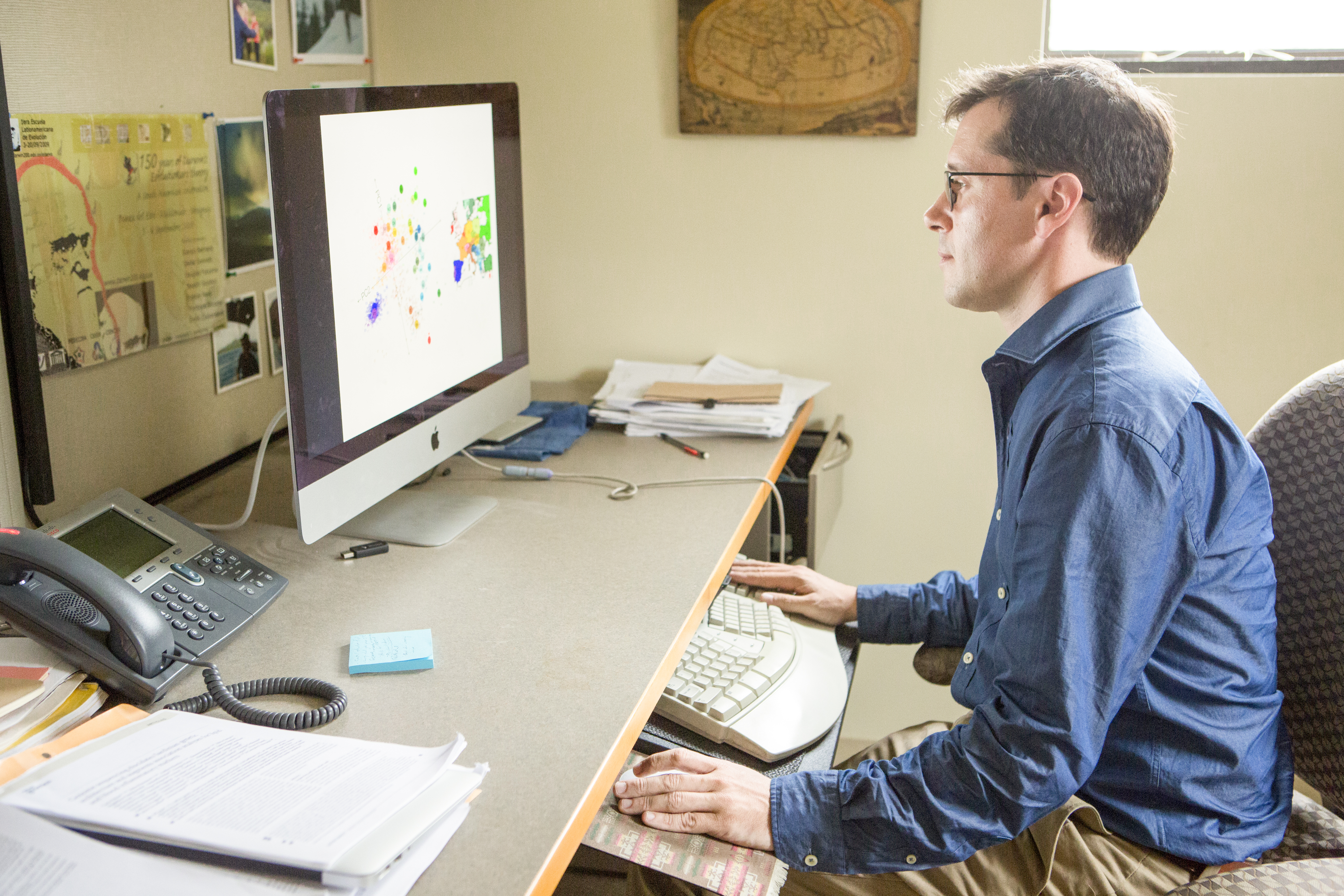 John Novembre is a computational biologist whose work sheds new light on human evolutionary history, population structure and migration, and the etiology of genetic diseases. He develops novel data visualization and analysis techniques to investigate the correlations among genomic diversity, geography, and demographic structure. In early work, he uncovered vulnerabilities in a classic approach to analyzing the geographic distribution of genetic diversity—principal component analysis (PCA)—and upended a long-standing interpretation of PCA waves as indicators of large-scale migration events. He went on to leverage this finding and, with collaborators, established a strong correlation between shared ancestral geography and genetic similarity among Europeans. This research affirmed the importance of place in determining DNA patterns and showed that it is often possible for ancestry to be pinpointed within a couple hundred miles through genetic sequencing.
