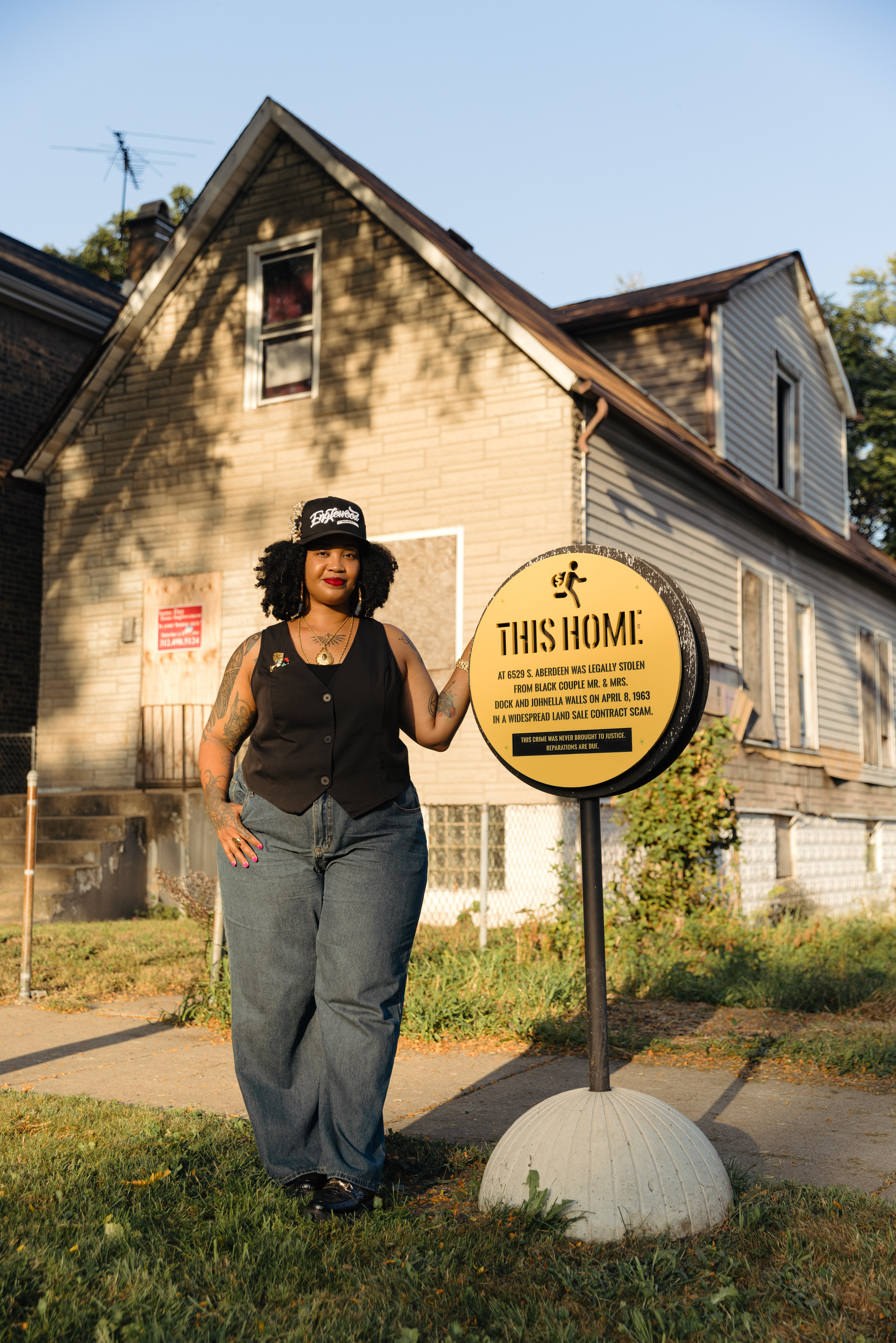 Johnson’s Folded Map Project (2018–ongoing) illustrates how decades of harmful policies have divided Chicago socially and physically. Johnson pairs corresponding residential addresses on the North and South Sides of the city’s grid of streets. She then documents the contrasts—and commonalities—between life on the two sides in portraits of the mostly White residents at home on the North Side and the predominantly Black residents at their homes in South Side neighborhoods. Additionally, she facilitates meetings between “map twins,” residents who live at corresponding North and South Side addresses, often miles apart on the same street. These meetings enable frank conversations and establish new bonds across the city. The project has expanded into a multifaceted initiative—including a short film, a school curriculum, and an action kit—that sparks cross-neighborhood connection. Building on this work, Johnson created the public art installation, Inequity for Sale (2021), to expose one of the causes of deterioration in South Side neighborhoods like Englewood, where Johnson is a lifelong resident. In the 1950s and 1960s, many houses in Englewood were sold to Black families under unscrupulous land sale contracts. These contracts demanded substantially more than fair market value and granted ownership only after the full amount of the contract was paid, effectively denying buyers equity in their homes. In front of houses sold or lost through land use contracts, Johnson installed bright yellow plaques describing the injustice of how residents lost their homes. An accompanying podcast, photographs, and recorded interviews with affected residents further educate Chicagoans about the histories of their communities.